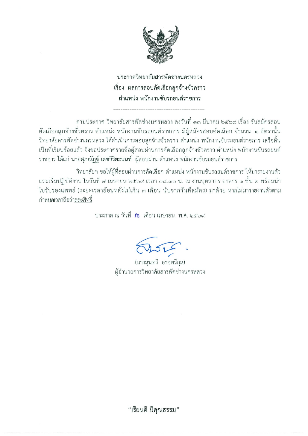 ประกาศผลสอบคัดเลือก พนักงานขับรถต์ราชการ